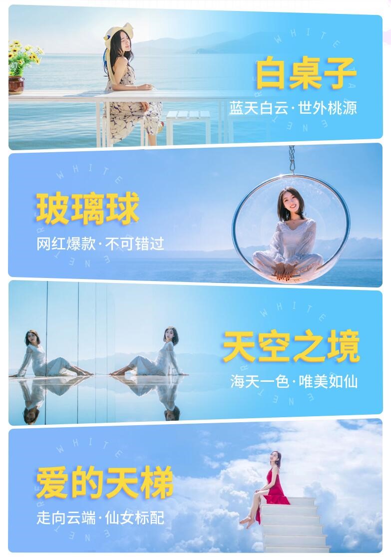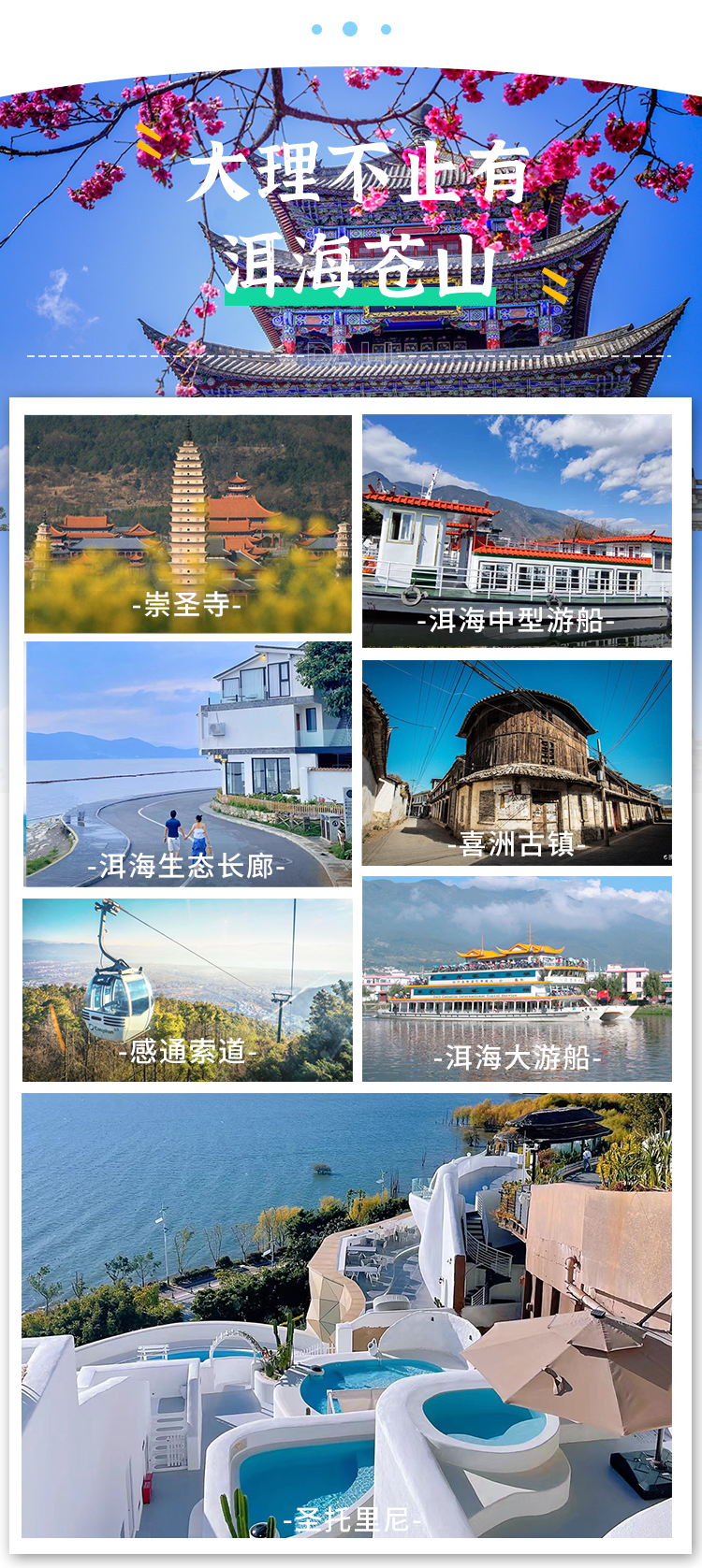 早餐后,出发前往苍山之麓,洱海之滨的"风花雪月"胜地【大理】:历史悠久,拥有厚重文化底蕴。苍山洱海珠联璧合,瑰丽迷人的自然风光和民族风情让其成为旅游胜地。抵达后前往游览大理的标志-【三塔风景区】:它为全国重点文物保护单位,金庸先生笔下《天龙八部》中天龙寺的原址,是大理妙香佛国的代表。后体验【吉普车网红旅拍】(4 人壹车,专业摄影师跟拍(赠电子照片),和最拉风的敞篷车一起凹造型,在苍山洱海间【网红玻璃球,天空之境,网红拍摄桌,天梯等】旅拍打卡。之后乘车前往我们特意安排的超网红、洱海新城堡-【理想邦-圣托里尼】。这里是理想的乌托邦世界,依山濒海的地中海风格小镇。此间的大理美不胜收,无须滤镜和单反,仅凭手机也能拍出惊艳照片,冠绝朋友圈。后入住酒店休息。