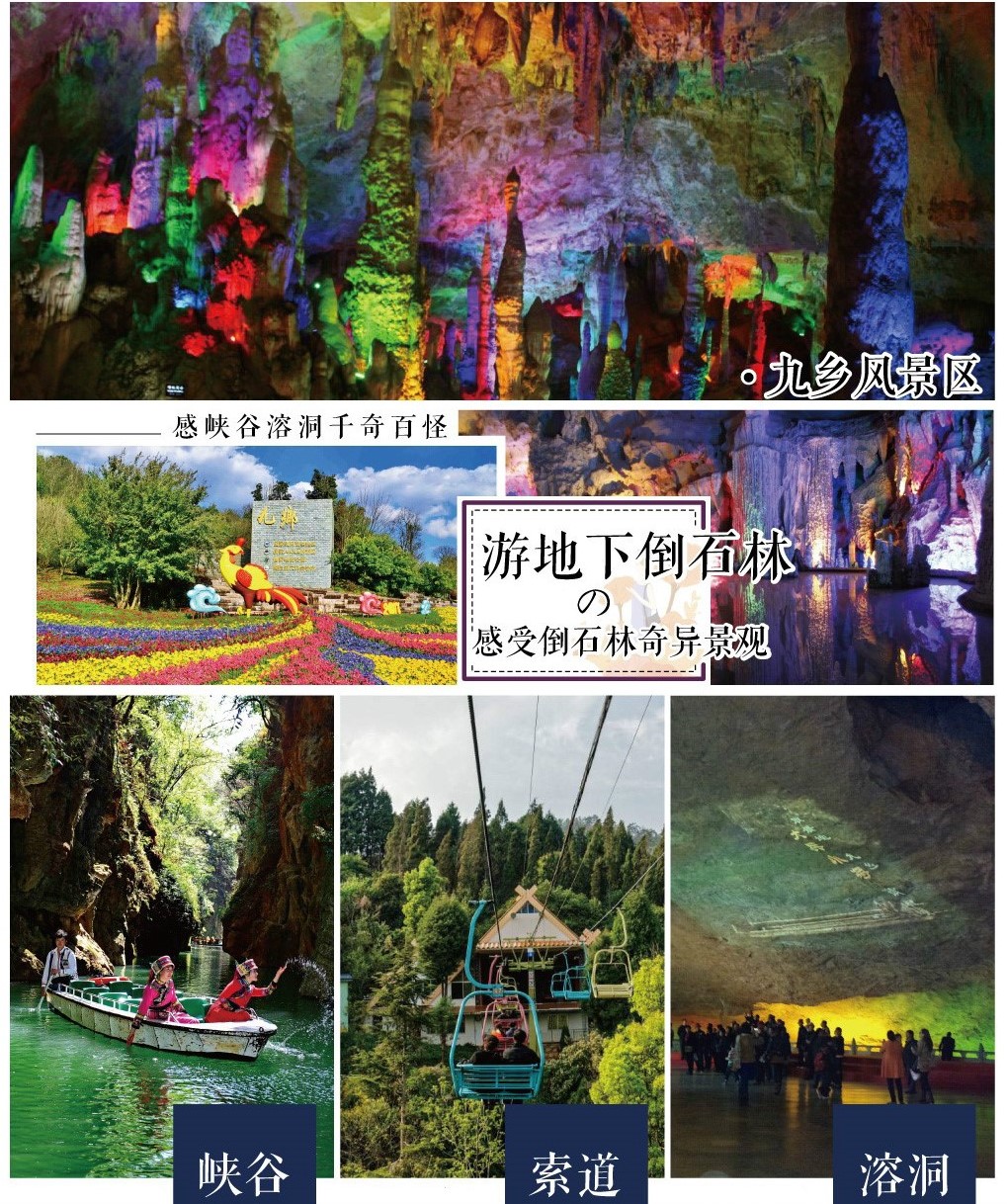 早餐后,乘车前往以喀斯特地貌为主的世界级地质公园、国家AAAAA级景区-【石林】(电瓶车已含)。石林是首批中国国家重点风景名胜区、中国国家地质公园、世界地质公园,成为中国四大旅游胜地之一。石林冬无严寒,夏无酷暑,四季如春,植物和动物资源非常丰富,有很多省级及国家级的保护植物,还有很多野生动物在此栖息。石林石峰林立、景观丰富多彩、是典型的岩容地貌发育地质博物馆。游览【大石林、小石林、步哨山、双鸟渡食、象锯石台、千钧一发、望风亭、剑峰池、阿诗玛遗像、石林湖等】。而后游览参观国家重点风景名胜区—【九乡】(索道已含),民间俗语说:“九乡溶洞九十九,数完溶洞白了头”,由此可见一斑。游览【荫翠峡、惊魂峡、雄狮厅、神女宫、雌雄飞瀑、神田、林荫寨等。而后游览参观地下倒石林(蝙蝠洞)】。乘坐九乡旅游索道—索道跨度近1000米,如一条飞虹,跨山过壑,横跨于青山翠岭之间游人可以领略到四季不同的九乡地表风光,可参观古人类遗址张口洞,跨越数万年的时空。晚入住酒店休息。