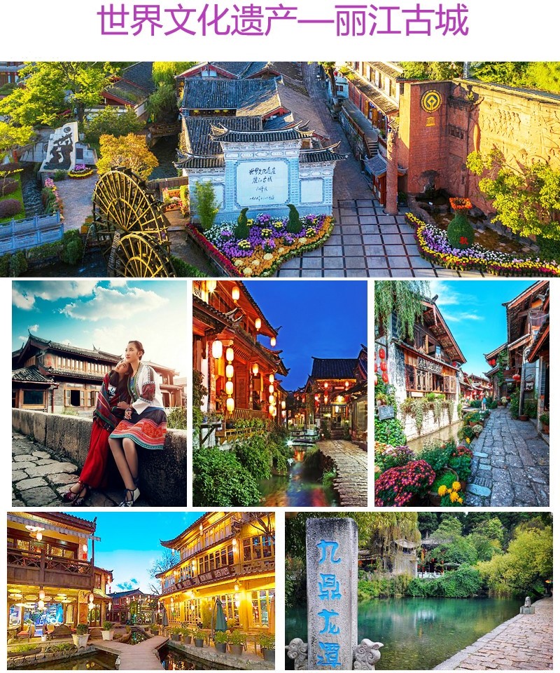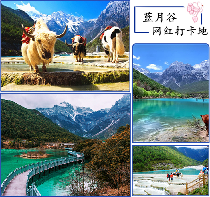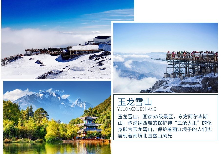早餐后,乘车前往具有“东方瑞士”之称国家AAAAA级景区—【玉龙雪山】{含一瓶氧气和防寒服(需归还)}。玉龙雪山以险、奇、美、秀著称于世,气势磅礴、玲珑秀丽。随着时令和阴晴的变化,有时云蒸霞蔚、玉龙时隐时现;有时碧空如水,群峰晶莹耀眼;有时云带束腰,云中雪峰皎洁;有时霞光辉映,雪峰如披红纱,娇艳无比。沿途经【甘海子】,乘冰川公园索道(如冰川公园索道停运,将由其它索道代替)前往【冰川公园】近距离赏雪、戏雪。在四万年前形成的白水一号冰川。被赞为"绿雪奇峰"的【冰塔林】,仿佛一块块巨大的冰翡翠,镶嵌在嶙峋的怪石之间。玉龙雪山冰川公园是进玉龙雪山游客必到的打卡地,蓝天、白雪、终年不化的冰川,海拔4680米的冰川公园,随手一拍都是美景。之后游览【白水河】,有“小九寨”之称的【蓝月谷】。观看由张艺谋执导的大型实景歌舞表演秀—【印象丽江】。演出以玉龙雪山的自然风光为天然背景,偶有风云突变,风、雨、雪、云、雾、阳光,这些都是大自然赋予实景演出的有效组成元素。随着节目的进行,大自然的演出也在不断变幻,时而风啸云涌,时而云开雾散,时而狂风骤雨,时而大雪纷飞,将带给您不同的体验。后入住酒店休息。今晚不吃团餐可随意品尝当地小吃及美食换下口味了。酒店住在中心区域,逛街方便、美食众多且价格实惠,如:烧豆腐、汽锅鸡、竹筒饭、腊排骨、黑山羊、野生菌、鸡豆凉粉、米灌肠、丽江粑粑等等任你品尝。