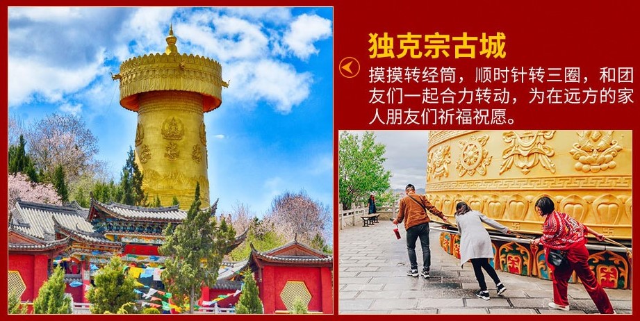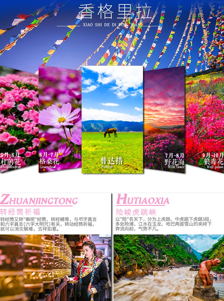 早餐后,清晨参观素有“小布达拉宫”之称的【松赞林寺】(电瓶车已含)。松赞林寺又称归化寺,它不仅是云南省规模最大的藏传佛教寺院群落,还是川滇一带的黄教中心。该寺依山而建,外形犹如一座古堡,集藏族造型艺术之大成,有“藏族艺术博物馆”之称。后前往游览茶马古道重镇之【独克宗古城】,“独克宗”藏语意为白色石头城,寓意月光城。它是中国保存得最好、最大的藏民居群,而且是茶马古道的枢纽。这里是雪域藏乡和滇域民族文化交流的窗口,汉藏友谊的桥梁,滇藏川"大三角"的纽带。千百年来,这里既有过兵戎相争的硝烟,又有过"茶马互市"的喧哗。参观拥有世上最大的转经筒的【龟山公园】,它是上天送给你最好的礼物,合力转动【转经筒】为远方的亲人、朋友送去祝福。后经【小中甸花海】前往虎跳峡镇;游览世界最美十大峡谷之一的【虎跳峡】,虎跳峡是世界上著名的三大峡谷之一,以奇险雄壮著称于世,江中虎跳石犹如孤峰突起,屹然独尊,江流与巨石相互搏击,山谷轰鸣气势非凡;感受其壮美与汹涌。前往【长江第一湾】欣赏、拍照,到达丽江入住酒店休息。今晚不吃团餐可随意品尝当地小吃及美食换下口味了。酒店住在中心区域,逛街方便、美食众多且价格实惠,如:烧豆腐、汽锅鸡、竹筒饭、腊排骨、黑山羊、野生菌、鸡豆凉粉、米灌肠、丽江粑粑等等任你品尝。