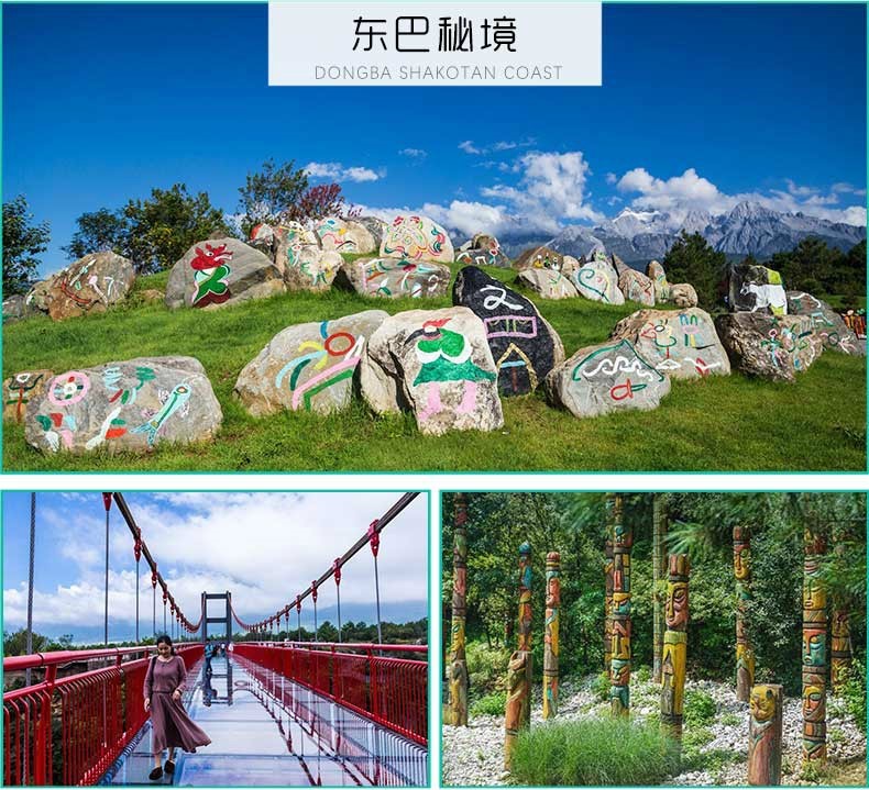 早餐后,根据时间昆明乘快铁(约3小时)前往丽江,抵达后乘车前往古老且神秘,融合自然景观,人文景观,风土民俗等为一体的花开四季的世外桃源—【东巴秘境】(含电瓶车)。景区分为雪山牧场、祭祀神坛、天空栈道、空谷花海、许愿灵池、爱情花园等四境十二景。游览参观:一个像金字塔一样的—雪山之源、藏传佛教的标志性建筑物—吉祥八宝柱、行走在堪称滇西北高原“第一玻璃栈道桥”—【玻璃吊桥】,横跨海拔 2880 米的东巴大峡谷,穿行其中谷中美景尽收眼底,桥上风景别致,谷底景色动人,还有峡谷中的最美村落—【木村】,你不仅可以观最美雪山全景,看纳西打跳歌舞,还可以赏民族手工工艺,逛最美木村集市。在这里,有可以发呆的高原牧场、可以诗情画意的秘境花谷、可以放声尖叫的天空栈道、更可以在纳西传统村落里感受东巴文化的韵味。后入住丽江酒店休息。之后自行前往被誉为“东方威尼斯”、“高原姑苏”的【丽江古城、四方街】,在世界文化遗产丽江古城中寻味纳西民族的纯朴和文化底蕴,漫步丽江街市,您将领略到“家家溪水绕户转,户户垂杨赛江南”的独特古城风貌 ,欣赏小桥、流水、人家的“高原姑苏”美景,晚上自由活动时不要错过丽江古城的夜景,在小桥边放一盏河灯,许一个心愿!到古城酒吧一条街感受古城酒吧文化的狂热,和天南地北的朋友对歌,渲泄平日工作和生活的压力。品味丽江夜晚独特的休闲时光,度过一个浪漫的夜晚。今天不吃团餐可随意品尝当地小吃及美食。酒店住在中心区域,逛街方便、美食众多且价格实惠,如:烧豆腐、汽锅鸡、竹筒饭、腊排骨、黑山羊、野生菌、鸡豆凉粉、米灌肠、丽江粑粑等等任你品尝。